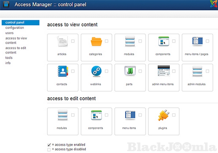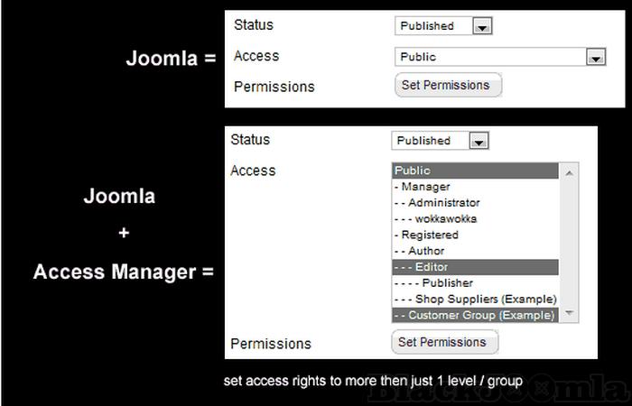 - Frontend viewing of content (based on Joomla usergroup OR accesslevel)