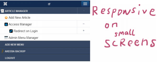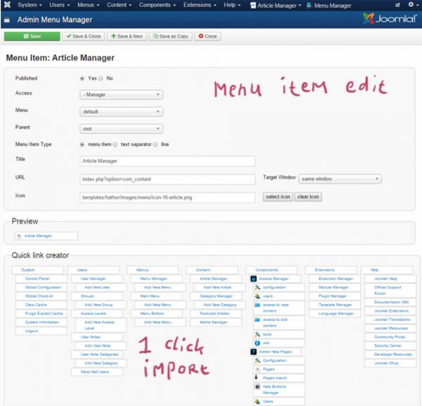 Add menu-items to the left, right, above or below, of the Joomla admin menu or replace the Joomla menu.