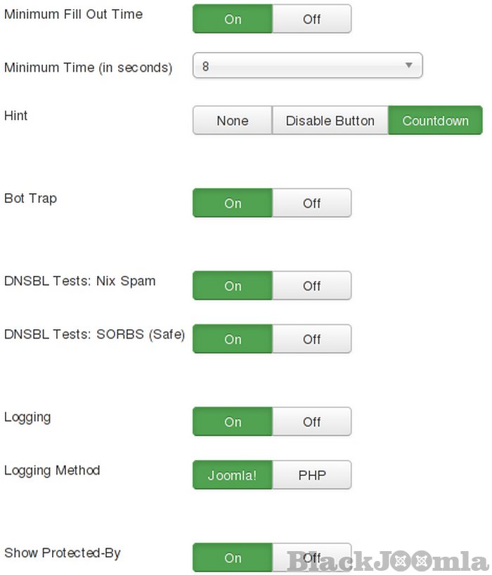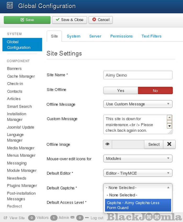 Aimy Captcha-Less Form Guard is easy to use and configure: Enable the plugin, configure your preferred methods and select Aimy Captcha-Less Form Guard in Joomla's global configuration dialog as default Captcha.