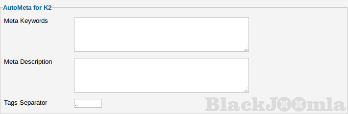 Meta Keywords: The text entered in this box will be applied to all K2 items keywords, will be displayed as "Keywords" html meta tag in the item page, after replacement of tags between '{' and '}' as described in the Available Tags section.