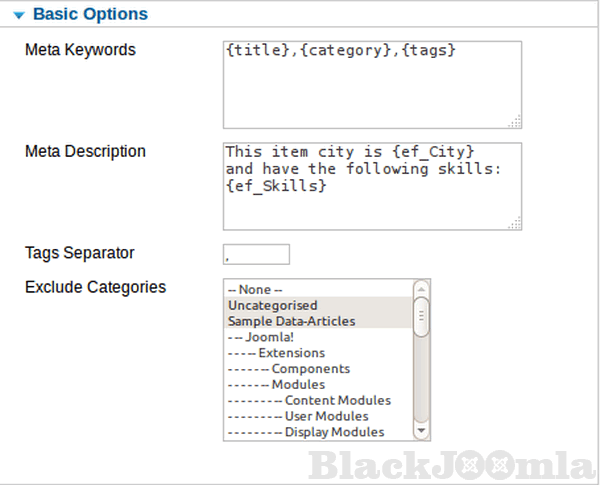 {ef_FieldAlias}:This will be replaced by extra field value, with alias "FieldAlias", when used in Meta Keywords and/or Meta Description, at both levels: Plugin and Category.