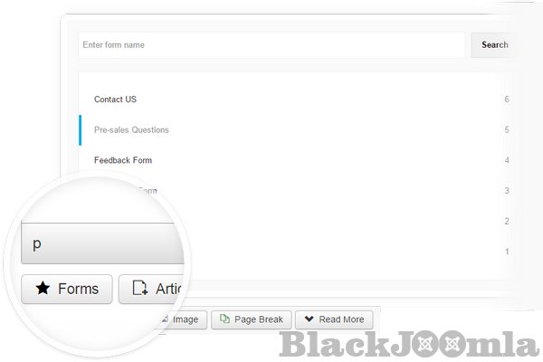 Balbooa Joomla Forms comes with a flexible method of displaying Joomla forms at the frontend. With help of shortcode system, you can easily add created Joomla contact forms to any part of your Joomla website. Joomla Articles, Custom HTML Joomla Modules and 3rd Party Joomla Extensions.