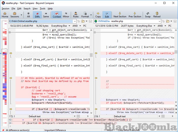 Beyond Compare's merge view allows you to combine changes from two versions of a file or folder into a single output. Its intelligent approach allows you to quickly accept most changes while carefully examining conflicts. Color coding and section highlighting allow you to accept, reject, or combine changes, simply and easily. When merging files you can change any line in the output with the built-in syntax-highlighting editor. By using Beyond Compare's powerful file type support and ability to favor changes from one file, you can trivially accept many changes without even seeing them.