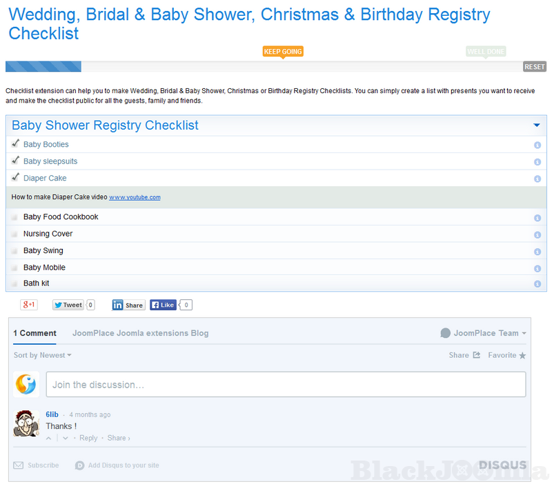 You can improve checklists visibility on the web by setting Checklist Title, Alias, Meta Data, and Custom Meta Tags (e.g. Open Graph). The extension is also integrated with Disqus commenting system and such social networks as Facebook, Twitter & LinkedIn for sharing your lists.