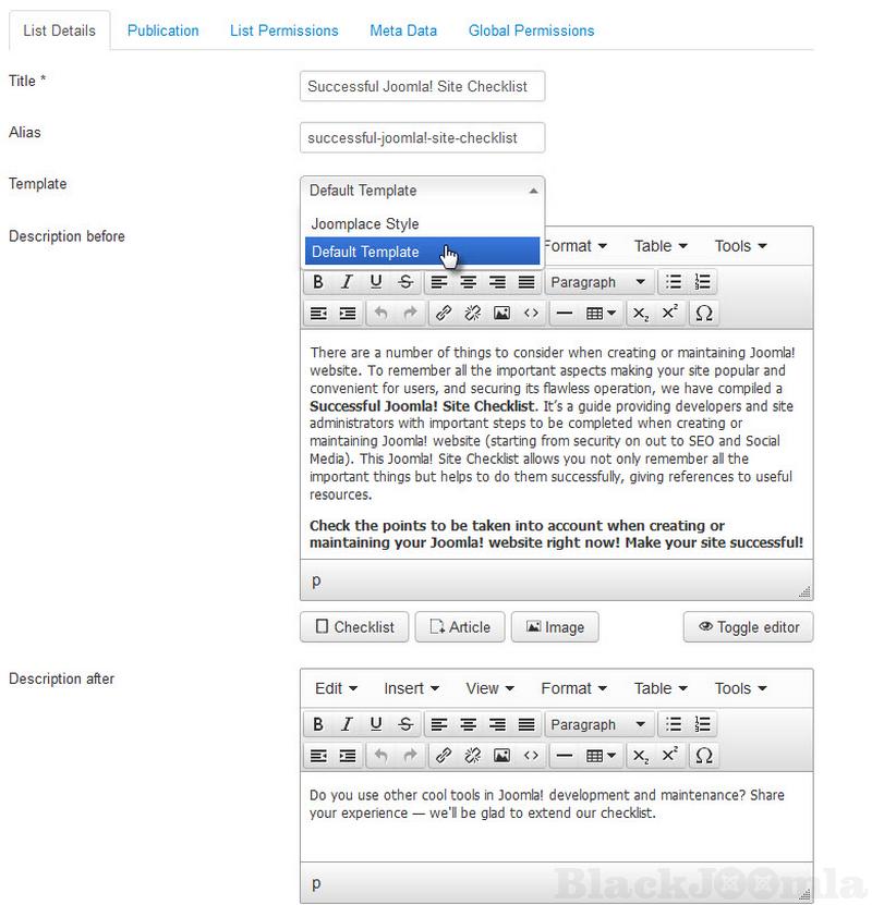 Each task can be accompanied by useful tips (the embedded HTML editor allows you to insert useful links, images, audio, and video files). Two modules come along with the component: Tag Cloud module and Latest Checklists module providing quick access to necessary lists.
