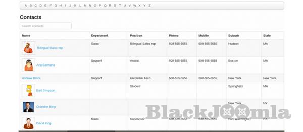 - Alpha Index Module, displays Alphabetic search links. It will filter contacts starting with the respective letter (optional).