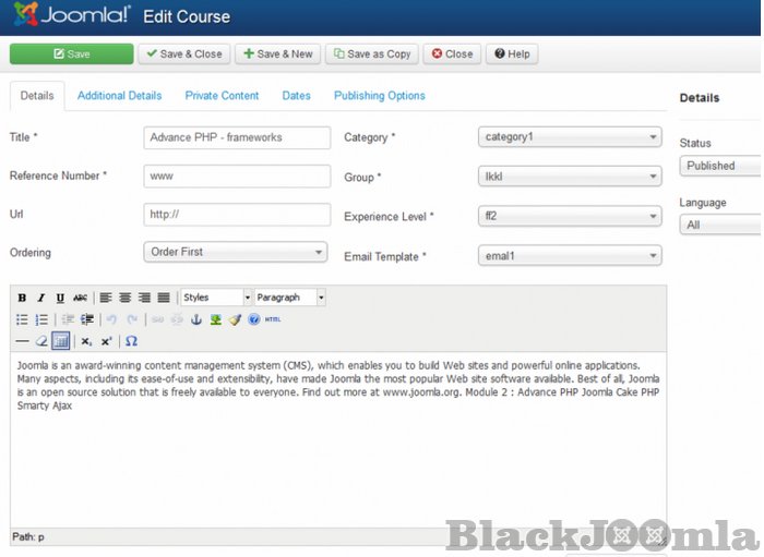 Course Manager is the only course listing component for Joomla! that allows you to run a directory of courses, classes or other events on your website with advanced booking forms, tags, PayPal integration, Search Engine Friendly URLs and much more. Fast, Simple and very Flexible.