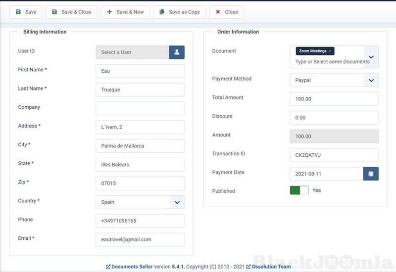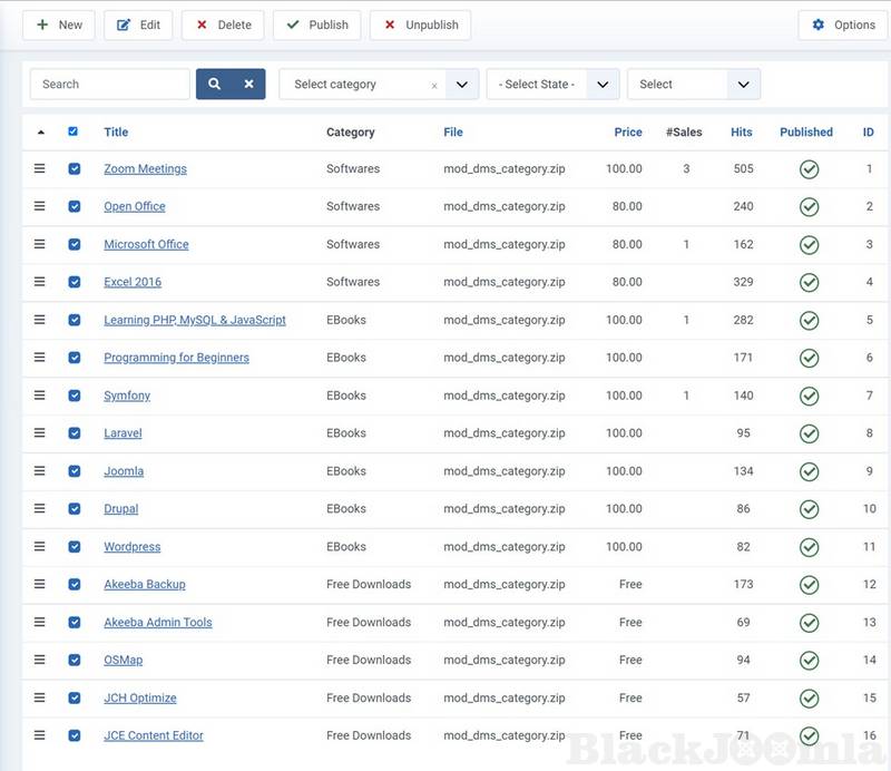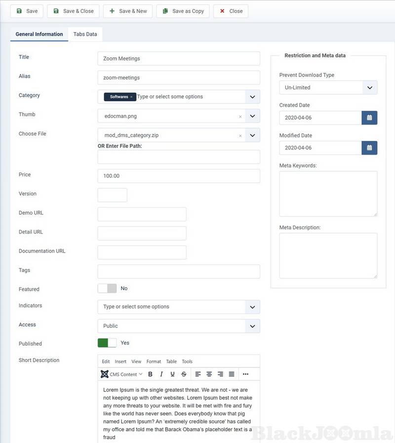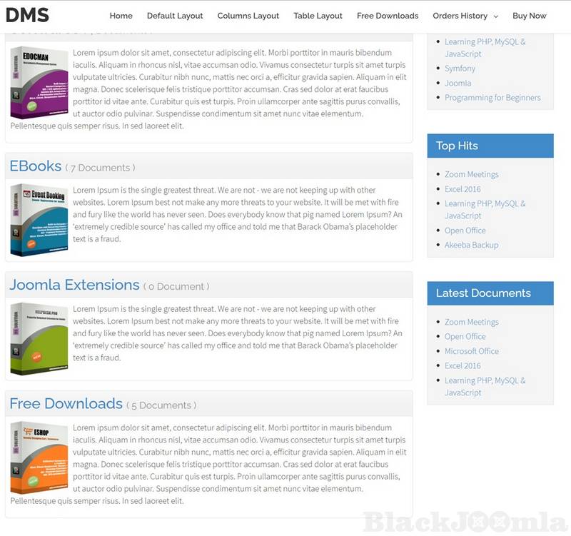 2. Documents management : DMS allows you to upload documents, enter document description, setup price and download restrictions from back-end of your site. From version 2.5.7, a document can be assigned to multiple categories.