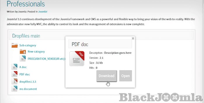 Get the most powerful yet easiest file manager for Joomla. Manage all your files and categories from your favorite editor. Create a file category, drag'n drop your files then insert category or a single file directly in your article. Dropfiles brings you a lot of professional features to manage files: 1 click ordering, 4 responsive themes, advanced search and filtering, Download statistics, file backup and much more! Using it with file restriction access? Native Joomla access level can be applied in one click. Working in all editors, backend and frontend. Perfect to work fast. Easy for final users.