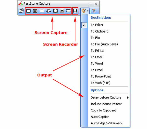 FastStone Capture saves images in BMP, GIF, JPEG, PCX, PNG, TGA, TIFF and PDF formats. Built-in screen recorder saves videos in WMV (Windows Media Video) format.