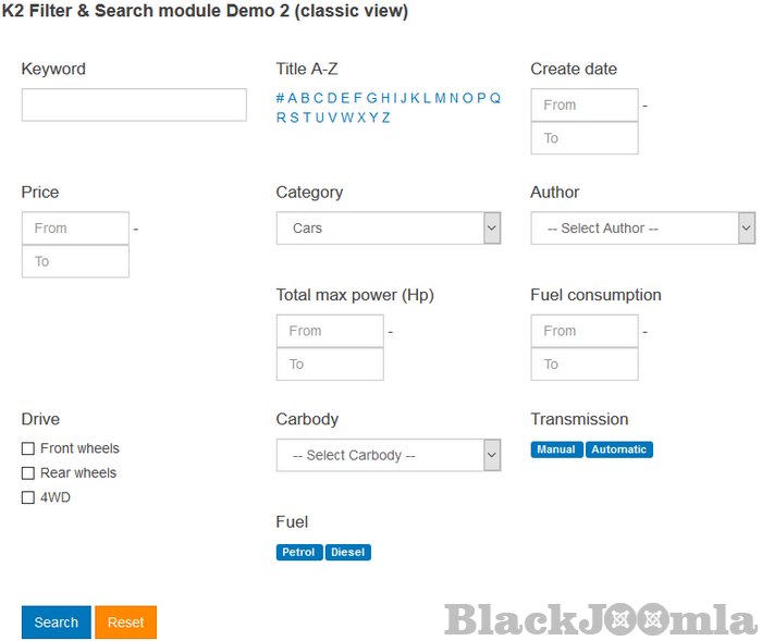 - Display search fields as text field, drop-down select, multi-select, slider, slider with range value select, radio, tag (ability for multiple tags select), category, item title (text and A-Z), item text, item rating, item creation/publish dates;