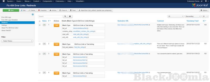 - When matched: when the error URL or the text matches, the user will redirect to a) URL, b) menu item, c) an error page with custom HTTP code, d) do nothing (just for the hits).