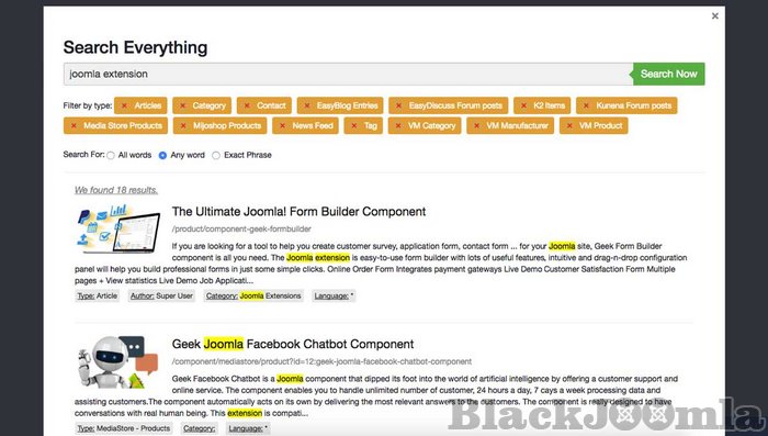 Supports to generate RSS Feed for search results. This is very useful feature in case users want to get a notification from your website for a new articles, new products (VirtueMart, HikaShop, JoomShoping,...), new documents (DOCman), etc…