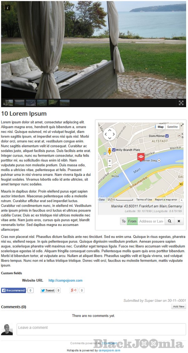 - Each marker has an individual description, this can be added with or without a picture (each marker can have custom icon & link to com_content, k2, sobiPro)