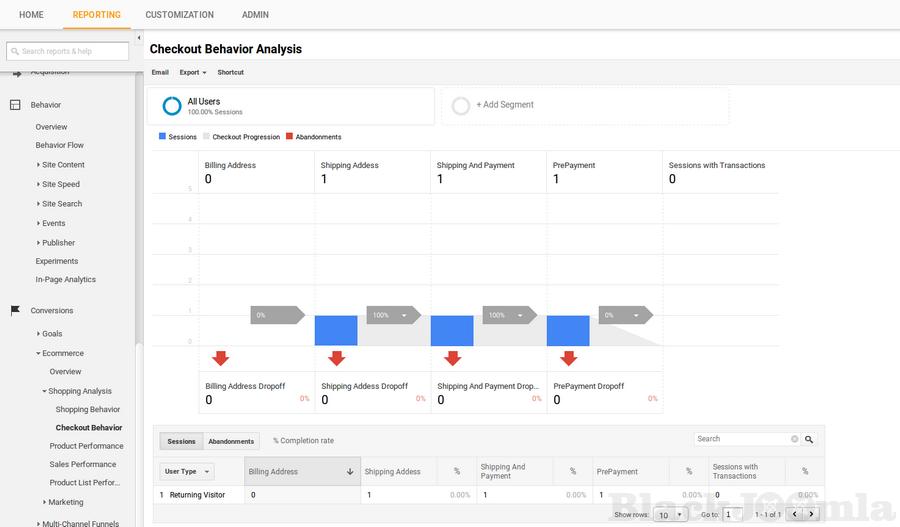 The Shopping Behavior Analysis report lets you see the number of sessions that included each stage of your purchase process, how many sessions continued from one step to the next, and how many abandoned the process at each stage.