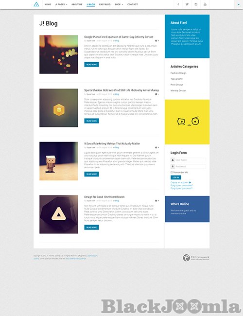 JA Fixel - responsive template for Joomla 2.5 & Joomla 3 version. It supports EasyBlog (Joomla blogging component) and JoomShopping (Shopping cart component). The template also supports RTL language layouts.