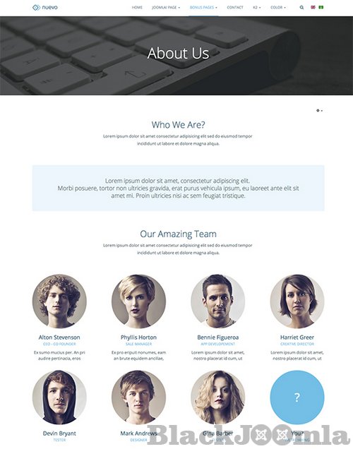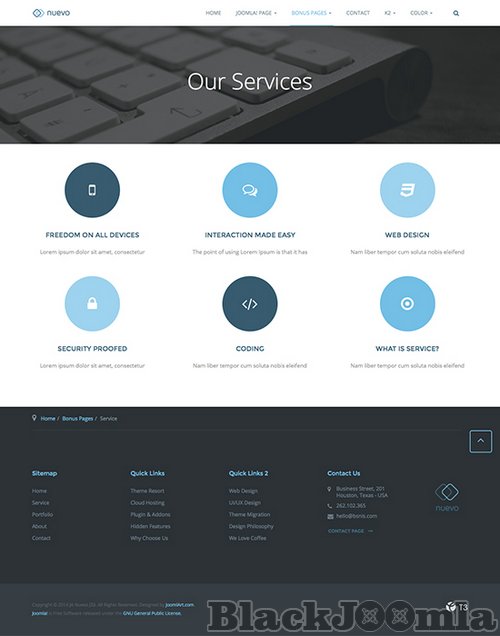 Along with other Joomla customized pages, the vault of JA Nuevo contains multiple bonus pages i.e. Service, Feature, About, Typography, Blogs, and Portfolio page. It’s a full fledged pack for building your app landing page.