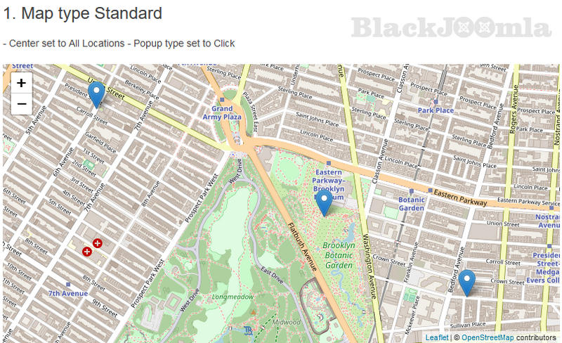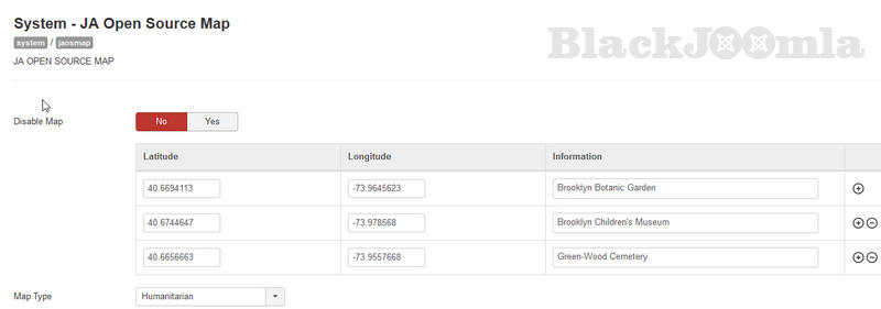 JA Open Street Map plugin main features are built-in as options and parameters in the back-end to help user configure and setup the map easier: map type, popup style, zoom level, map size and more.