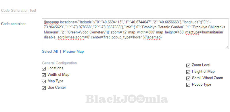 The tool is to help generate short code to embed the defined Open Street Map to article, custom HTML module, contact form ... Admin can change configuration values and select parameters then copy the code. You can have different configurations for each map by using the code generator. Change the default location to your desired location every time you generate code.
