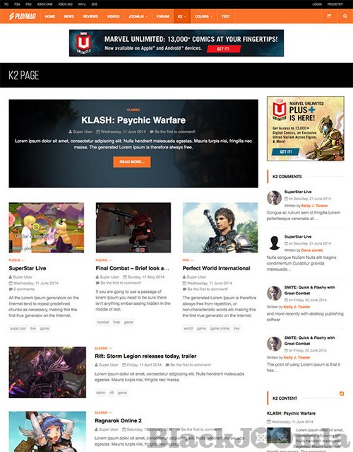 Kunena powers the forum in the JA Playmag and K2 component has also been styled great for this template. JA Playmag is flexible, you can easily make changes to suit your needs: twist the CSS properties with ThemeMagic, transform the layout with Layout Configurator or build your own Megamenu. This template supports RTL language layouts.