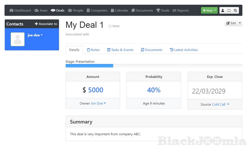 - Ability to add more details to deal like company name, select stage, status , expected close, source, primary contact, probability