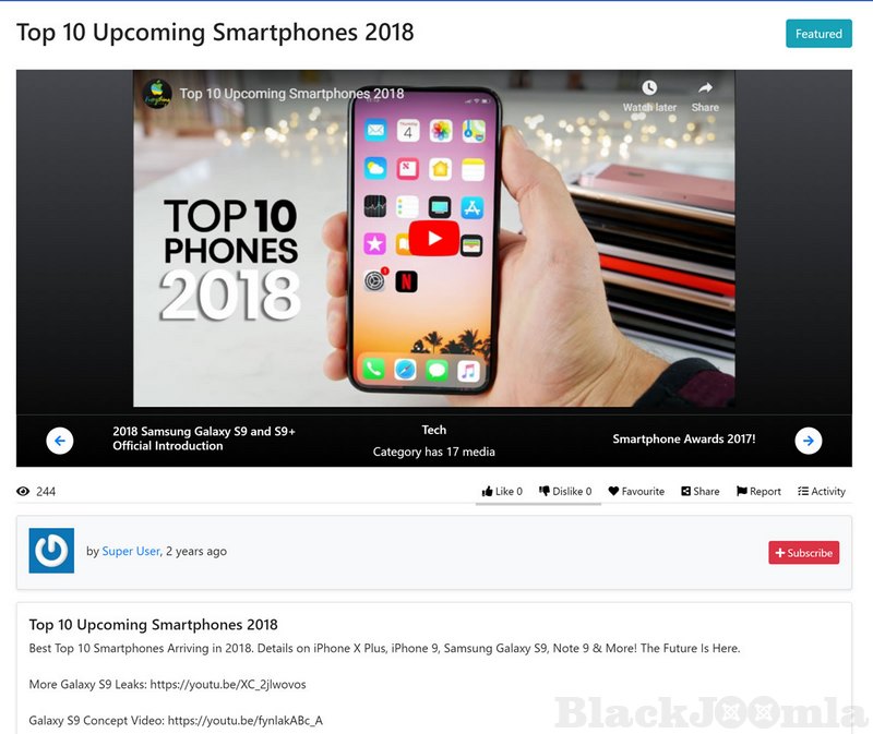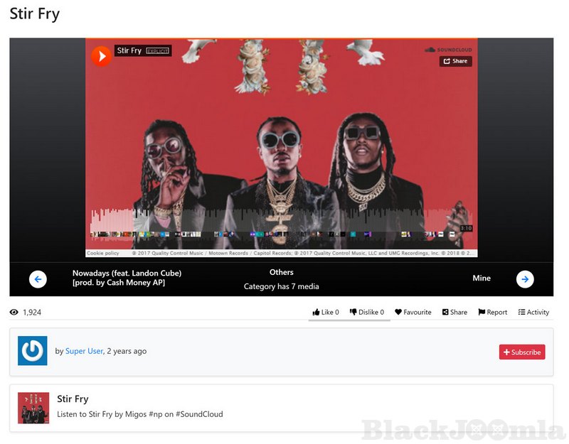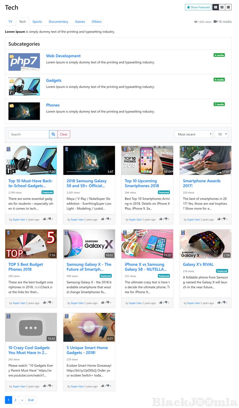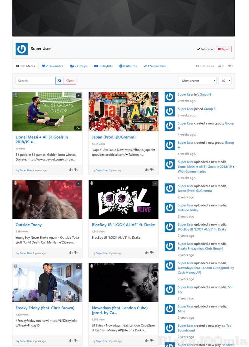 - Media items organization true categories, tags, channels, playlists, albums and groups