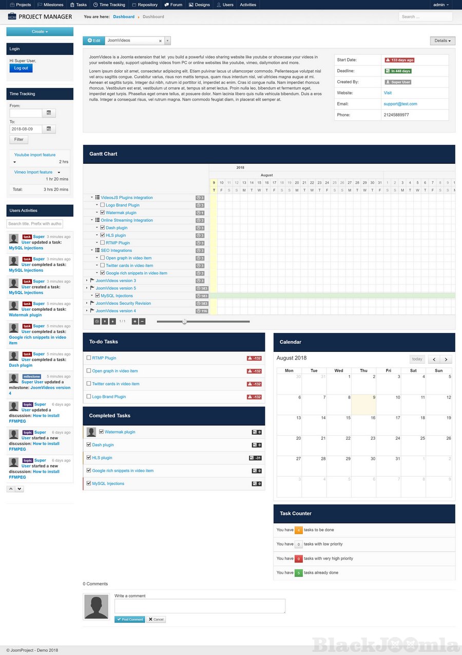 - Many modules (Gantt chart, calendar, tasks list, time counter, time tracker ...)