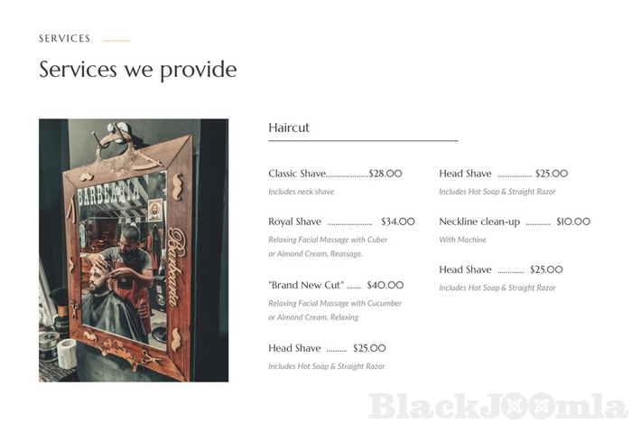 Service Price Lists: The costs of the services in this hairdresser and beauty salon Joomla template come in nicely designed price lists. It says what these prices include for the customers.