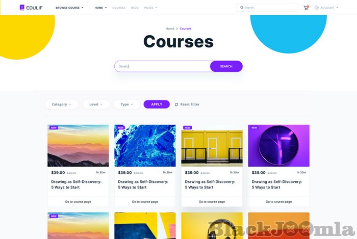 We care about how your learners will find courses on your site. For that particular reason, we added 2 course filters to this Joomla LMS template. You can choose any of them to use with your site. Both of them come with easier navigation and course display.