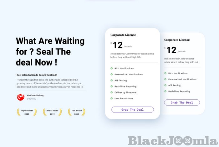 One of the most unique things about the Startup Landing Joomla template is that it has 4 pricing plan designs to choose from. You can literally choose anyone that suits your purpose. Each of these pricing plans resonates the template’s card-style design and goes well with any of the 6 home variations.