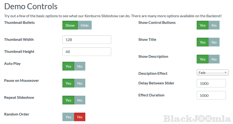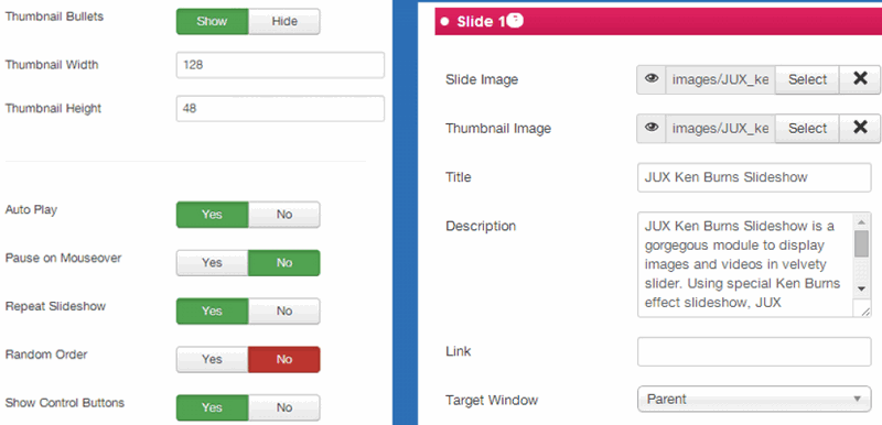 JUX Ken burns slideshow is a kind of simple extension and it can be controlled easily with an on/off option in it’s the backend.