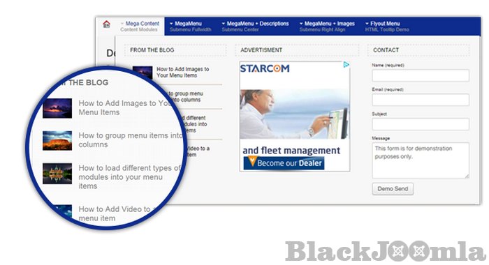 JUX Mega Menu is a type of drop down menu like other basic menu module. But what making it different with other traditional drop down style menu is that the module allows you to display a ton of content in menu item including text, images, module or articles.
