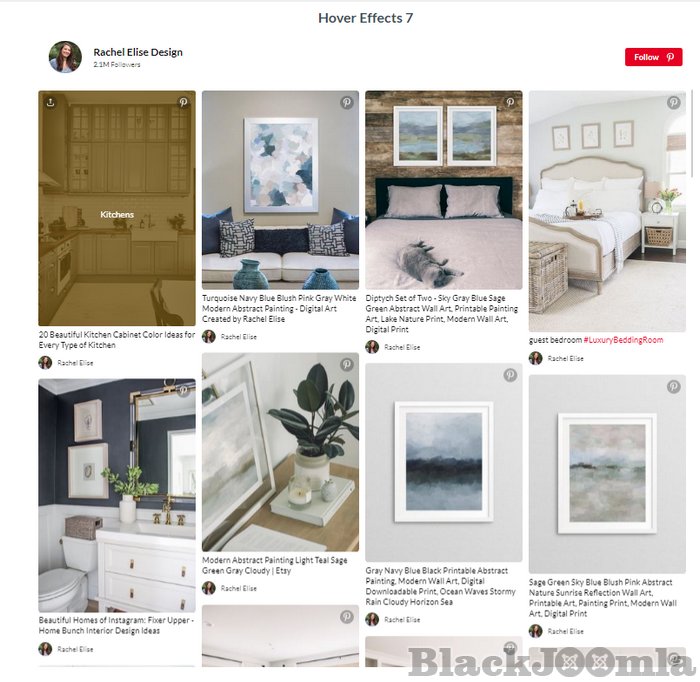 JUX Pinterest Feed creates up to 9 hover styles which allow you the freedom to choose which style attracts you most. Most of these effects are so inspiring and creative as fade in/out, Stripe, Gradient, etc.