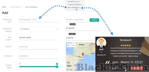Geolocate testimonials, from a Google Maps address or just point a place on the map!
