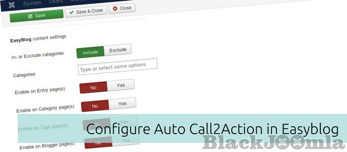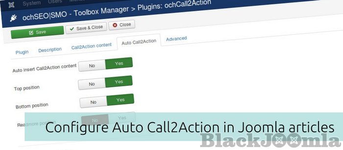 You get full control on where you want to place the Call2Action content: simply by entering the tag {call2action} anywhere in your blog / article or automatic on the top, bottom, readmore positions (or a combination of) of the selected articles (Joomla!, Easyblog, K2).