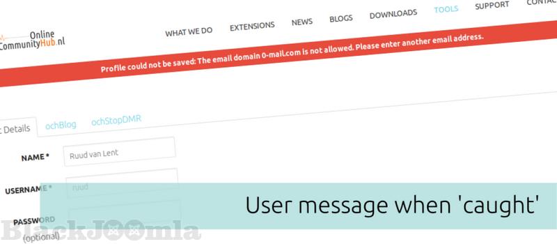 With the ochStopDMR system plugin, you can check every mail domain that a user uses to register on your website or subscribes with on your AcyMailing mailing list. When a user registers or (configurable) when a user changes his user profile, a request is made to an external API that checks the domain part of the E-mail: