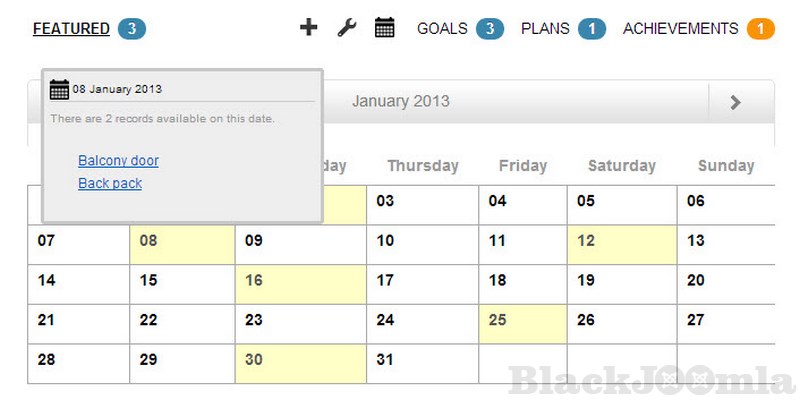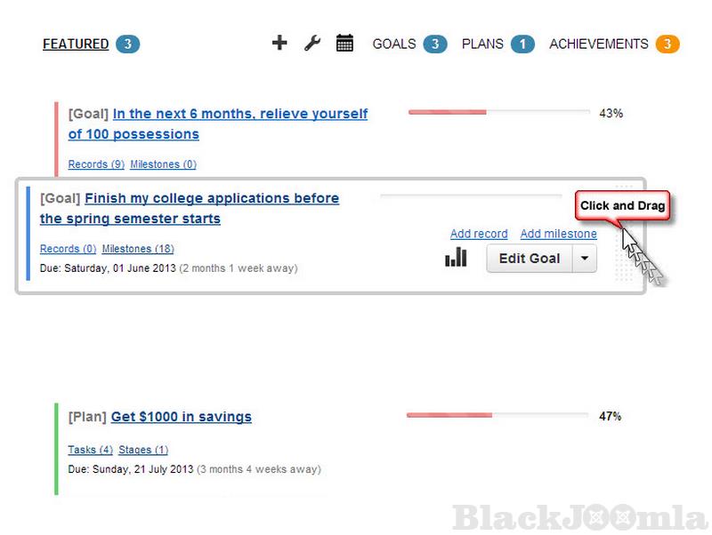 Personal Goals Manager Component is specially designed to help your Joomla! site users to set personal goals and plans, track achievements progress and organize personal schedule management. The personal manager extension can also be used to improve habits quickly and without great efforts.