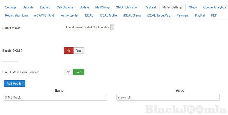 - Use Custom Email Headers No/Yes - Enabling this option will allow you add custom headers to the emails sent by RSForm!Pro. In order to add a new email header, you will have to enable this option, click on the "Add new" button and afterwards complete the header "Name" and "Value".