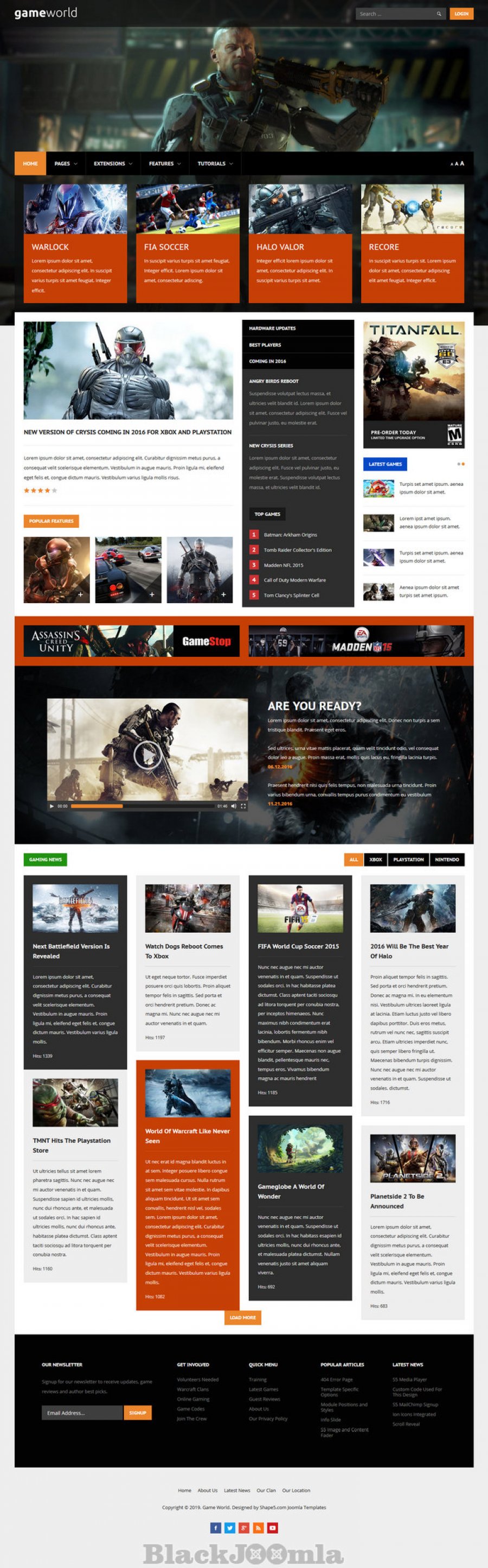 Game World comes with a transparent header and top row area, so that you can highlight your amazing pictures in the S5 Image and Content Fader and the top background image option, where you can set your own custom background image.
