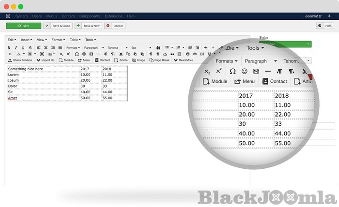Import spreadsheets into articles or Custom modules by using the "Import file" button through the editor.