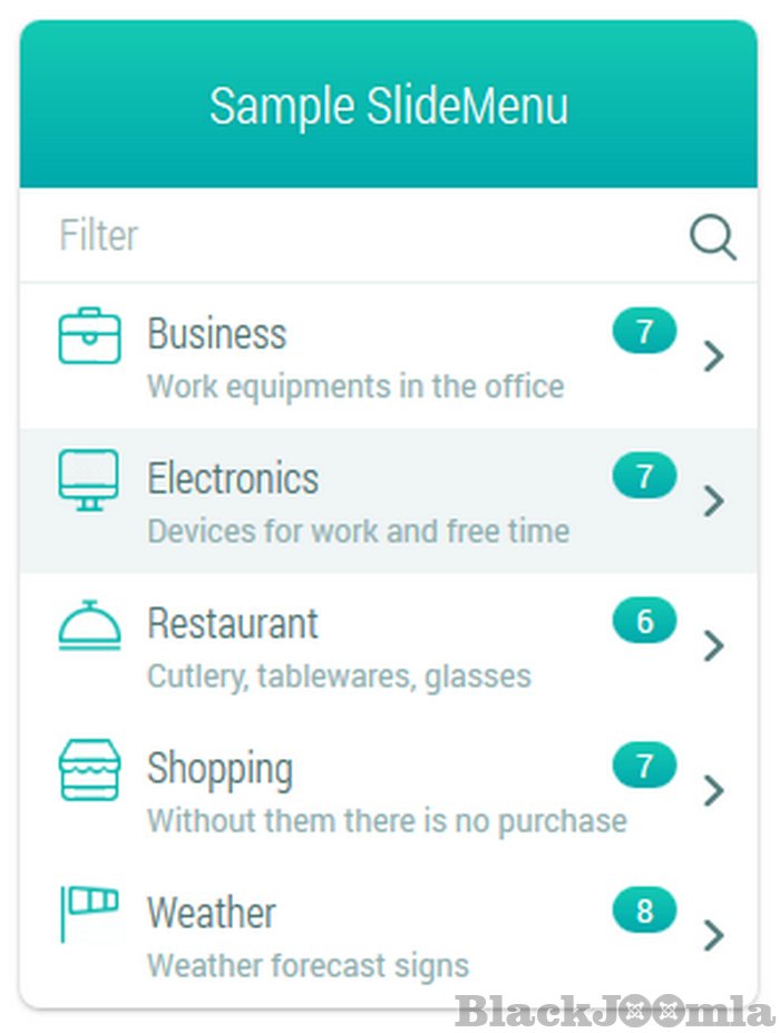 With the powerful built-in filter feature you only need to type a part of the menu item's title or description, and most relevant results will appear in a list below. That is a killer-feature against any other menu solutions on the market. Just type a few characters, then the matched results will appear in moments, and you don't need to browse through the whole menu structure. The filter bar is fully designable with selectable magnifier buttons, close icons, and background-color.