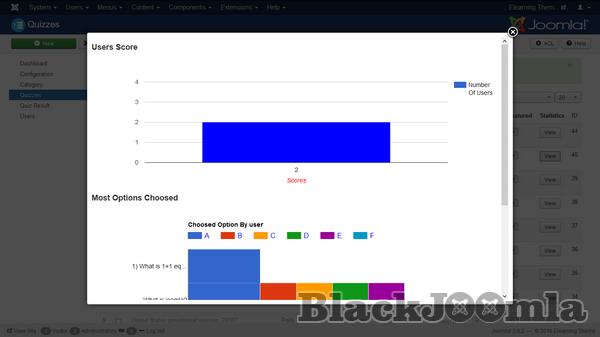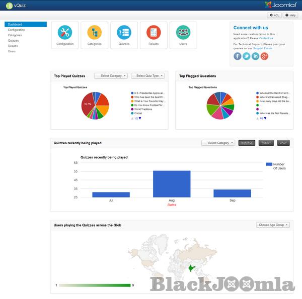 vQuiz facilitated with Special JomSocial and Community Builder integration plugins which allows to display User's created quizzes and quizzes played Results on their JomSocial and Community Builder profiles. vQuiz also featured by a Flexible Dashboard with a variety of widgets including various types of graphs, charts and pivot tables to create interactive, interesting and insightful dashboard. A large variety of Widgets provided to admin and users (in Frontend) by vQuiz to give insight about the Quizzes, Quiz Players, Quiz Results, Scores etc. to let you monitor and analyze Quiz Players performance.