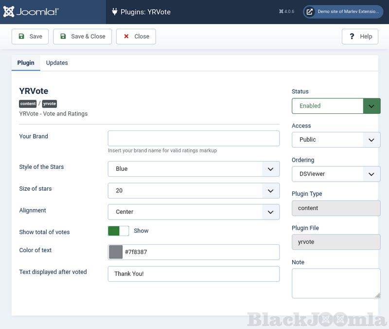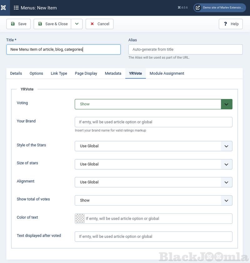 - Instead default Joomla Vote plugin - YRVoe is integrated into the menu options for articles, categories and in the article options.